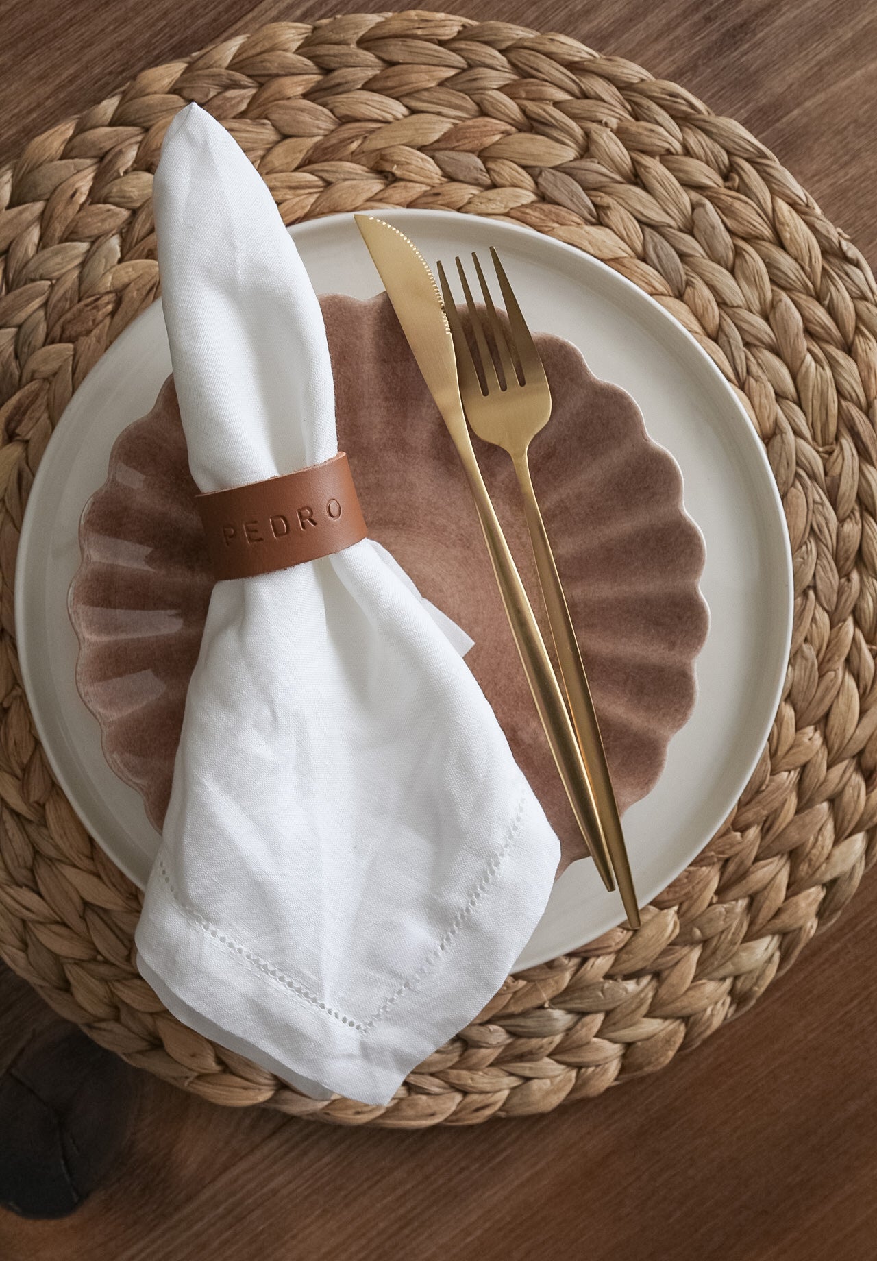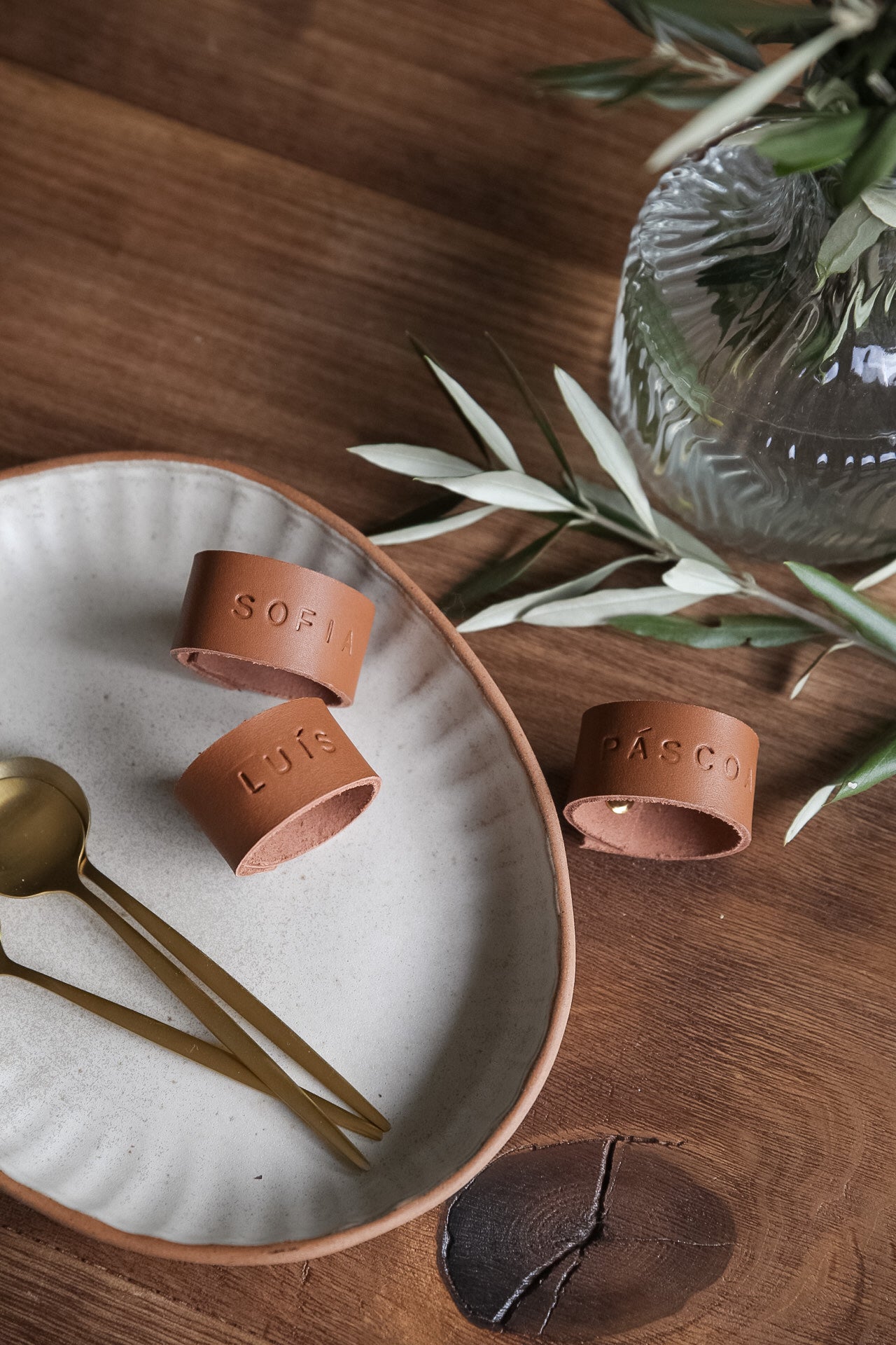 Argolas em pele vegetal para guardanapos. Estas argolas podem ser personalizadas com o nome ou inicias de cada pessoa. Vai certamente transformar o seu guardanapo com este apontamento tão bonito e delicado.