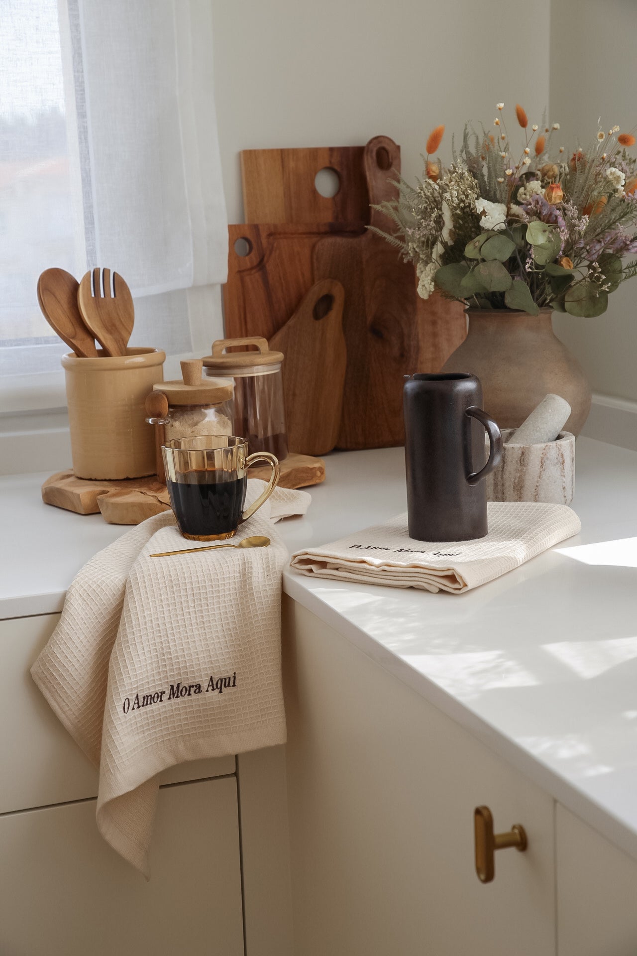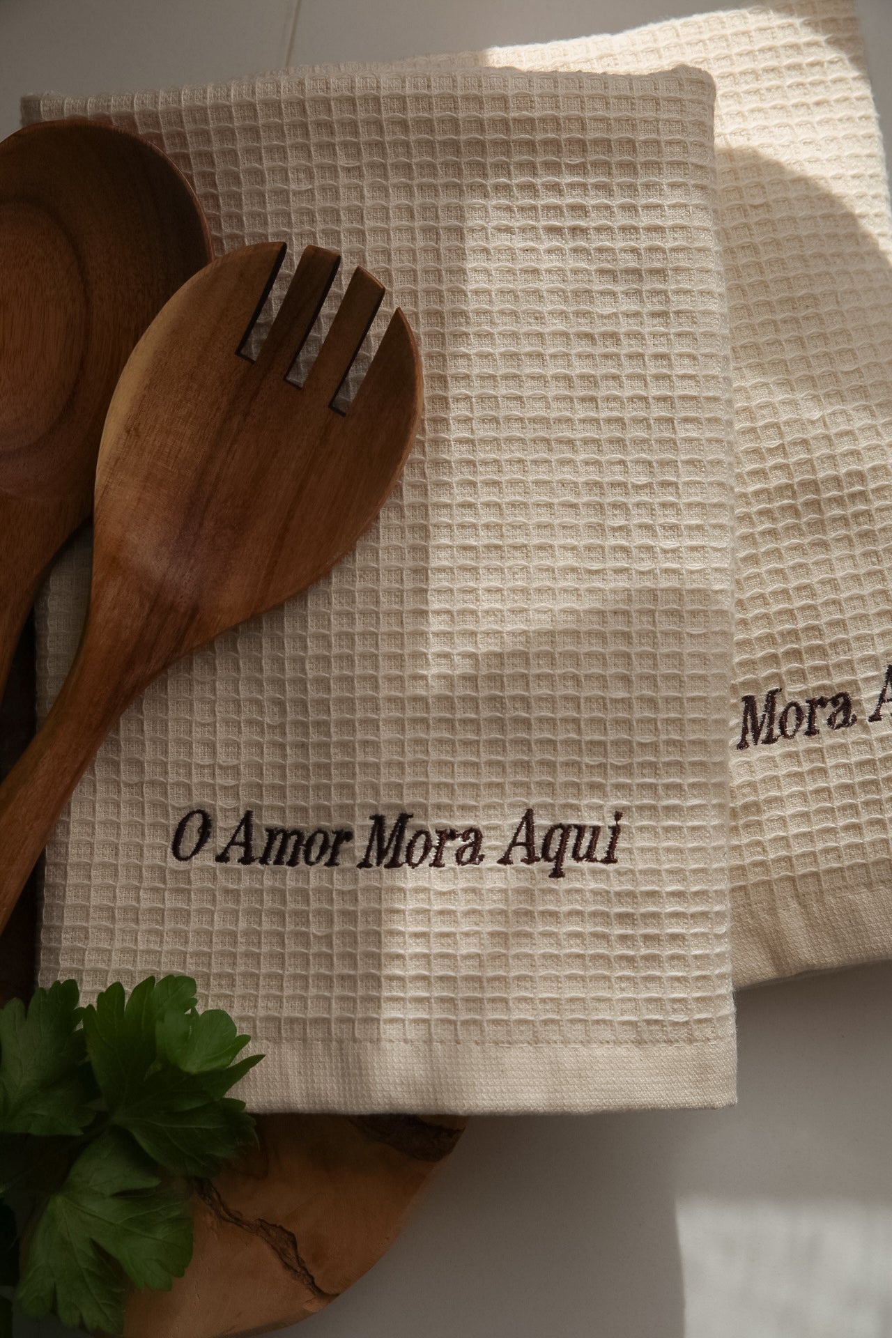 Pack de 2 panos de cozinha em algodão personalizado “o amor mora aqui”.